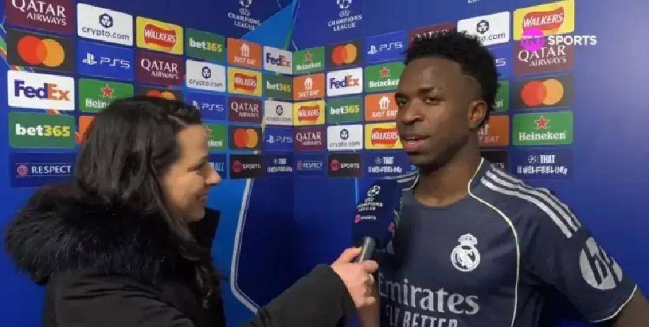 维尼修斯进了两个球。他的庆祝动作有故事。他说上次没做成。这次补上。他在欧冠淘汰赛参与28粒进球。但他不看数据。每天穿皇马球衣是儿时梦想。现在和队友并肩作战。他很满足。本场他错失机会。他希望下场继续进球。帮助球队前进。他视皇马为顶级俱乐部。每场胜利都不易。